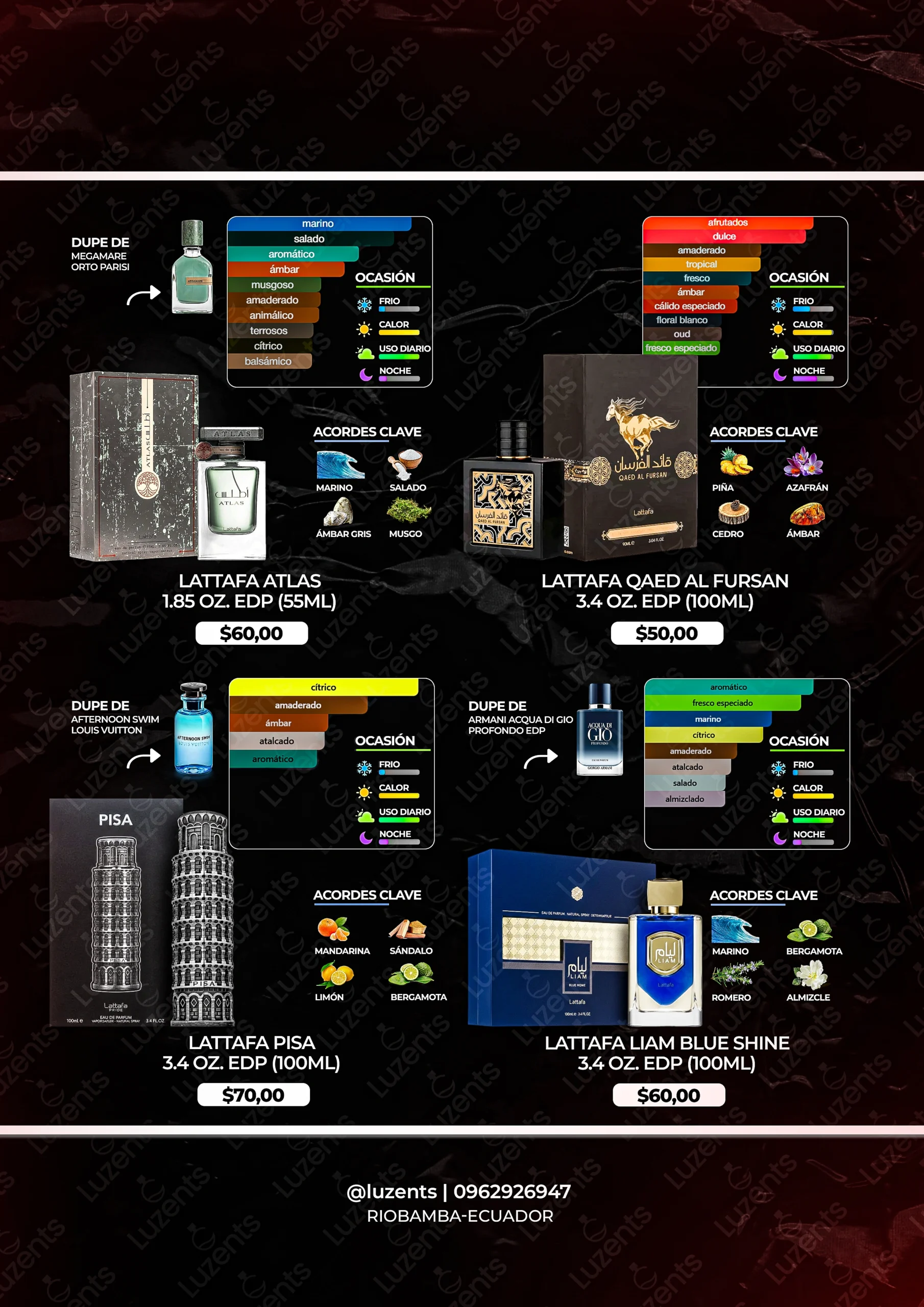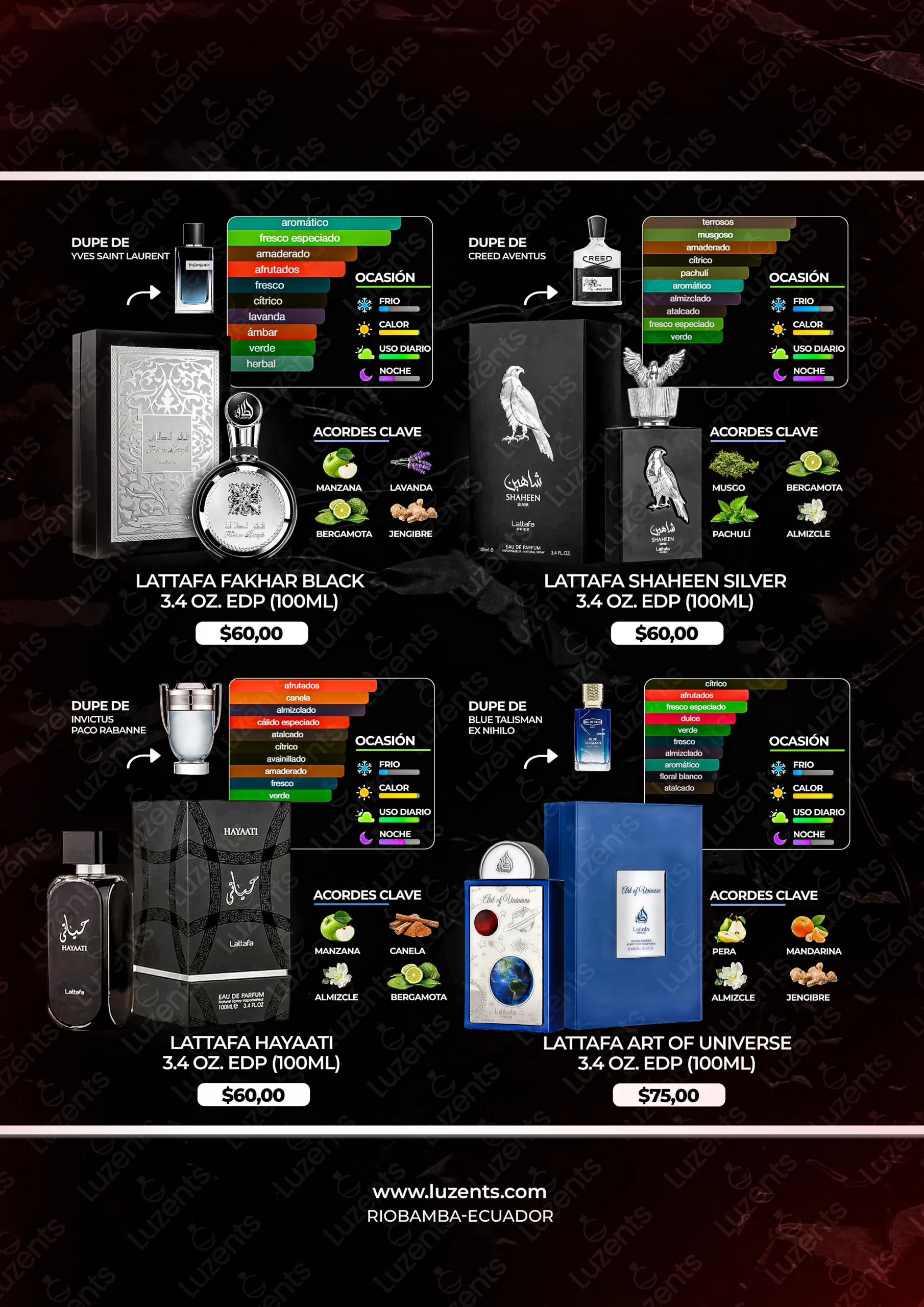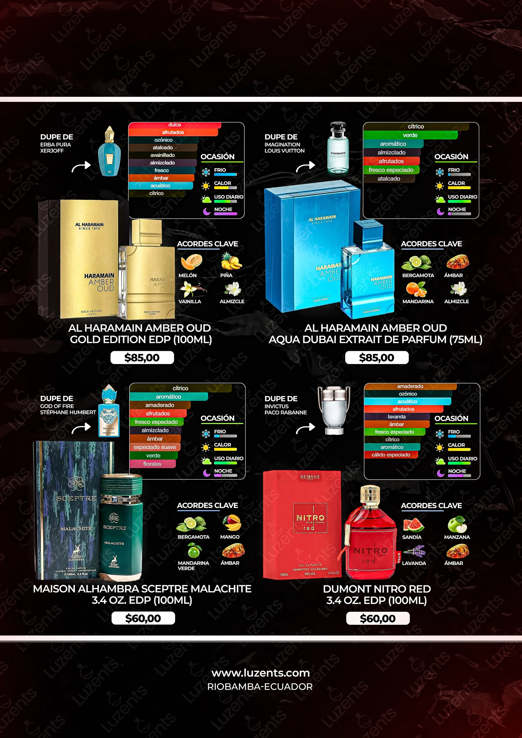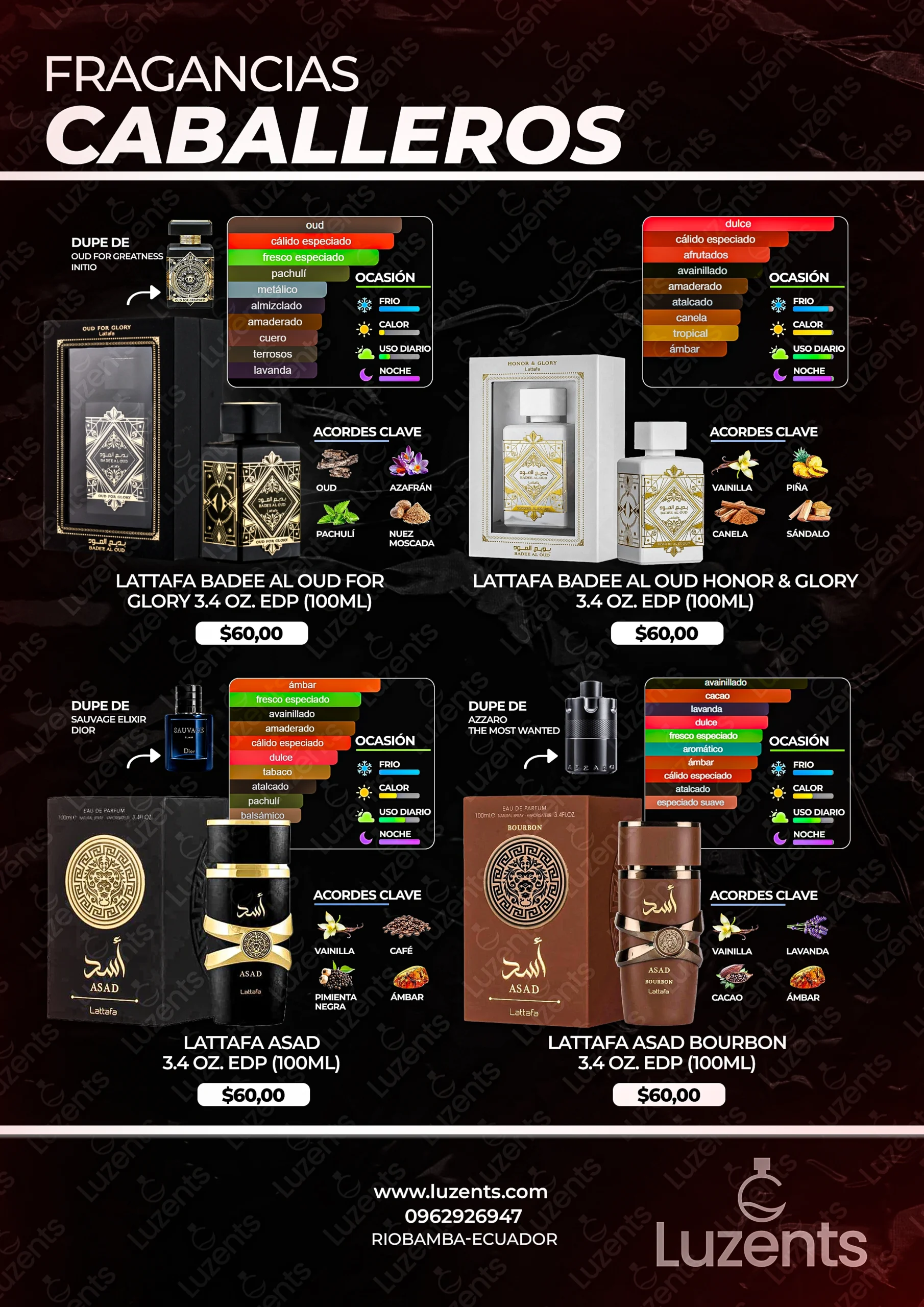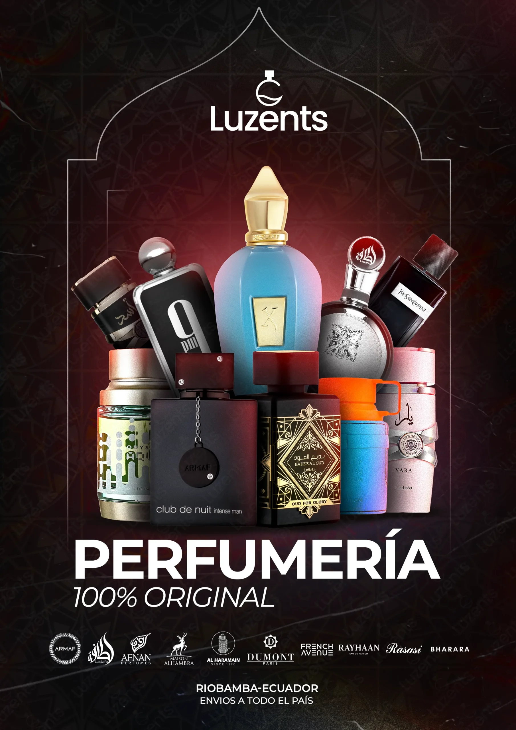 Bienvenido al catálogo exclusivo de Luzents, donde encontrarás la mejor selección de perfumes originales y decants en Ecuador. Nos especializamos en traer para ti las fragancias más deseadas de casas de diseñador y la mejor perfumería árabe, garantizando autenticidad en cada gota.