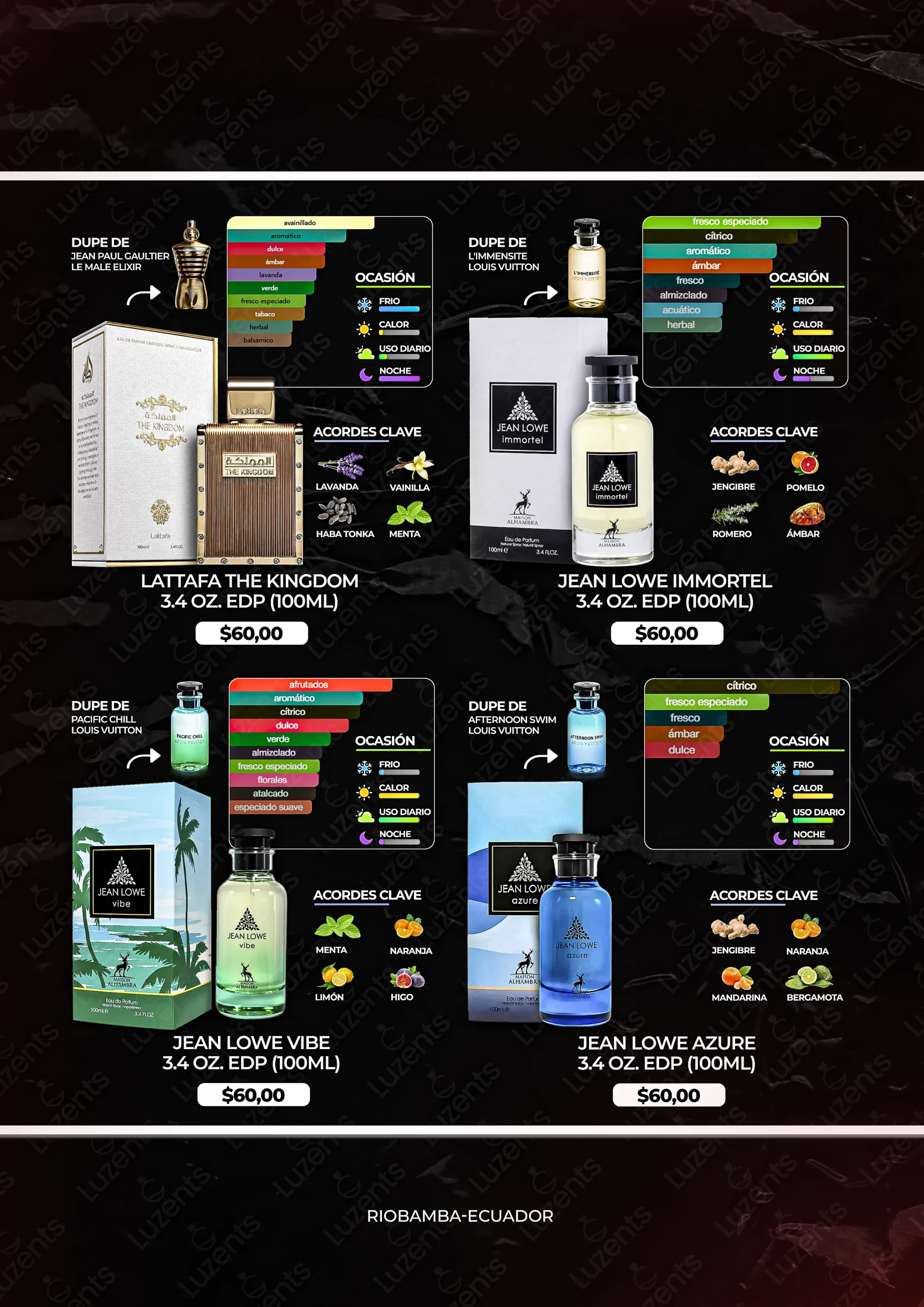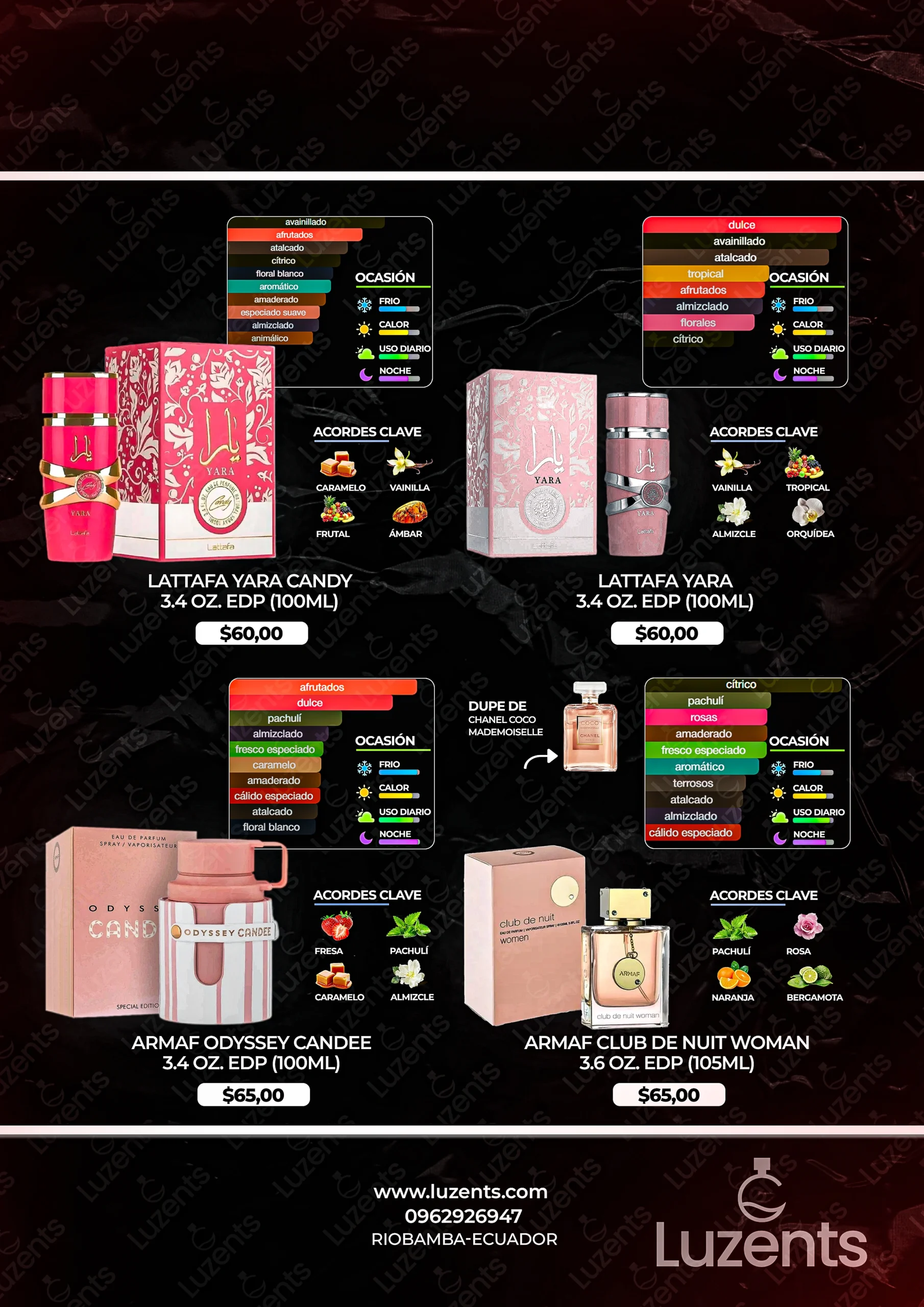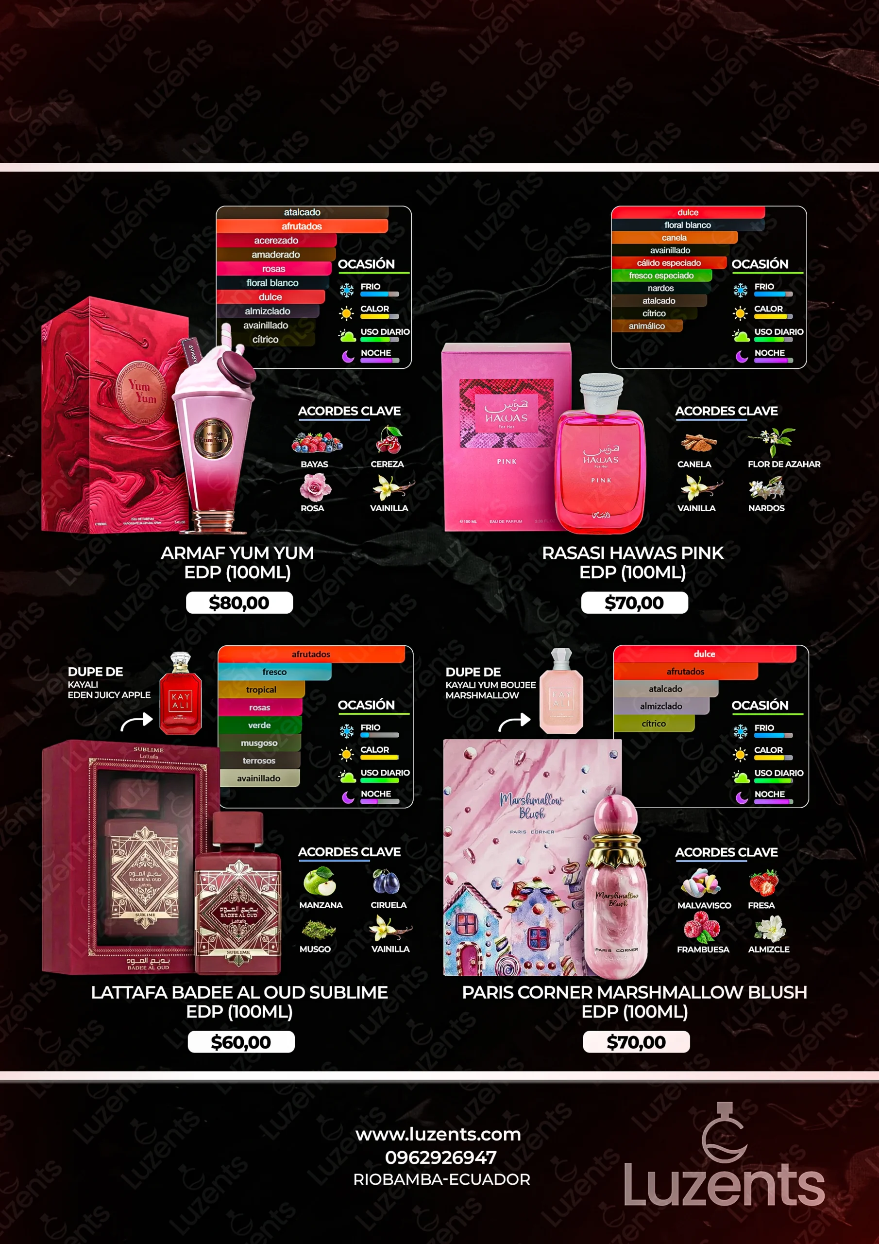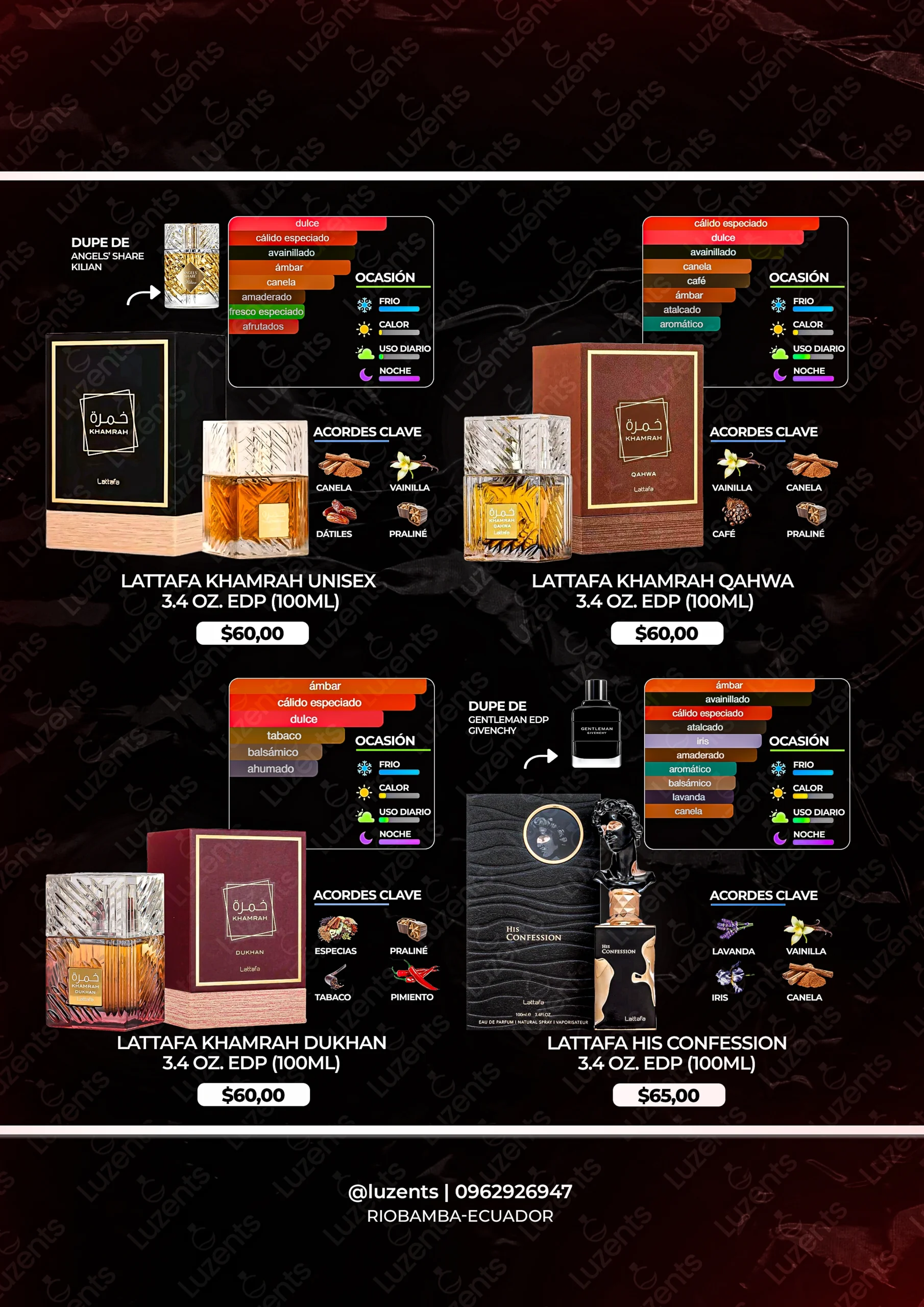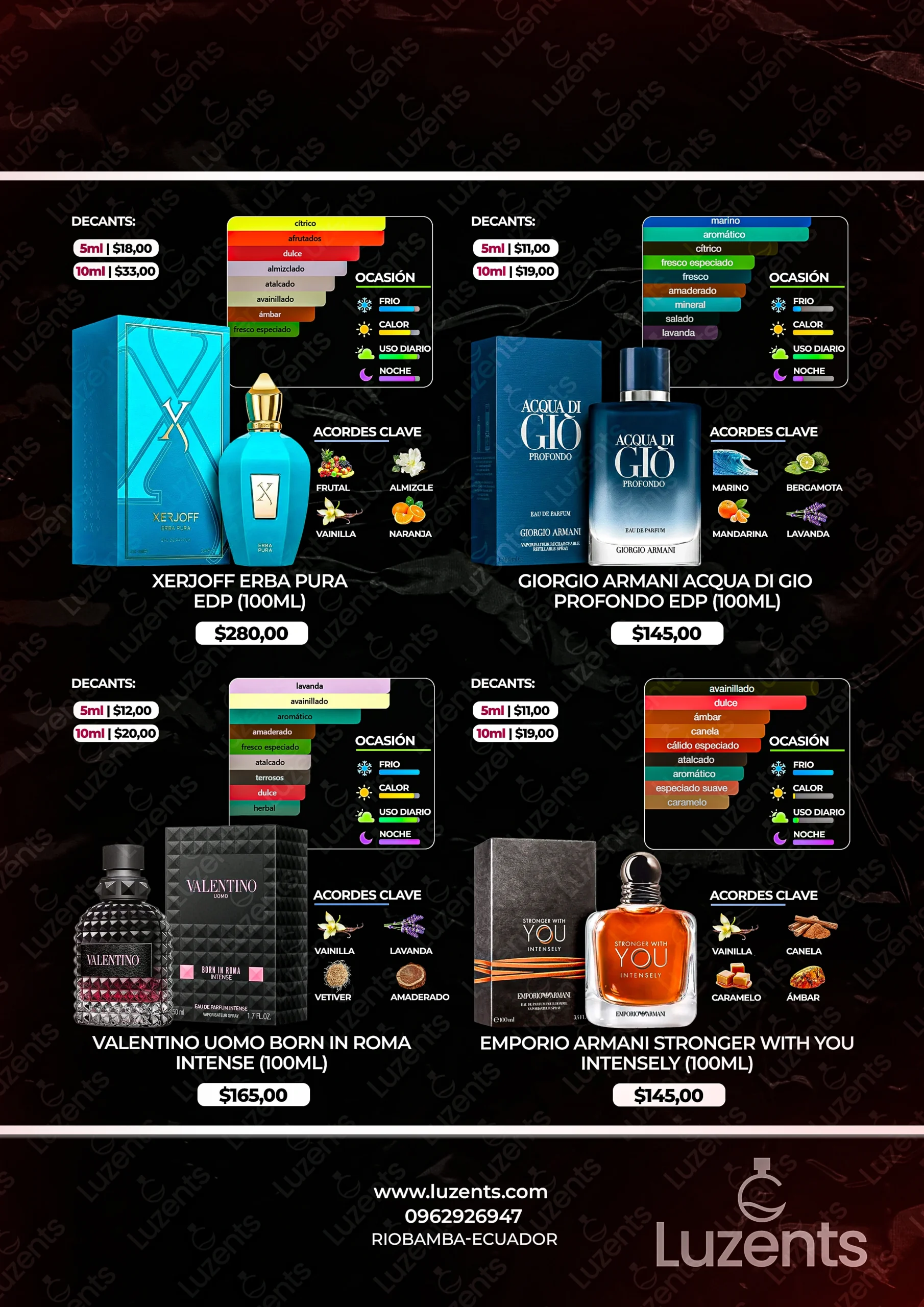 Bienvenido al catálogo exclusivo de Luzents, donde encontrarás la mejor selección de perfumes originales y decants en Ecuador. Nos especializamos en traer para ti las fragancias más deseadas de casas de diseñador y la mejor perfumería árabe, garantizando autenticidad en cada gota.