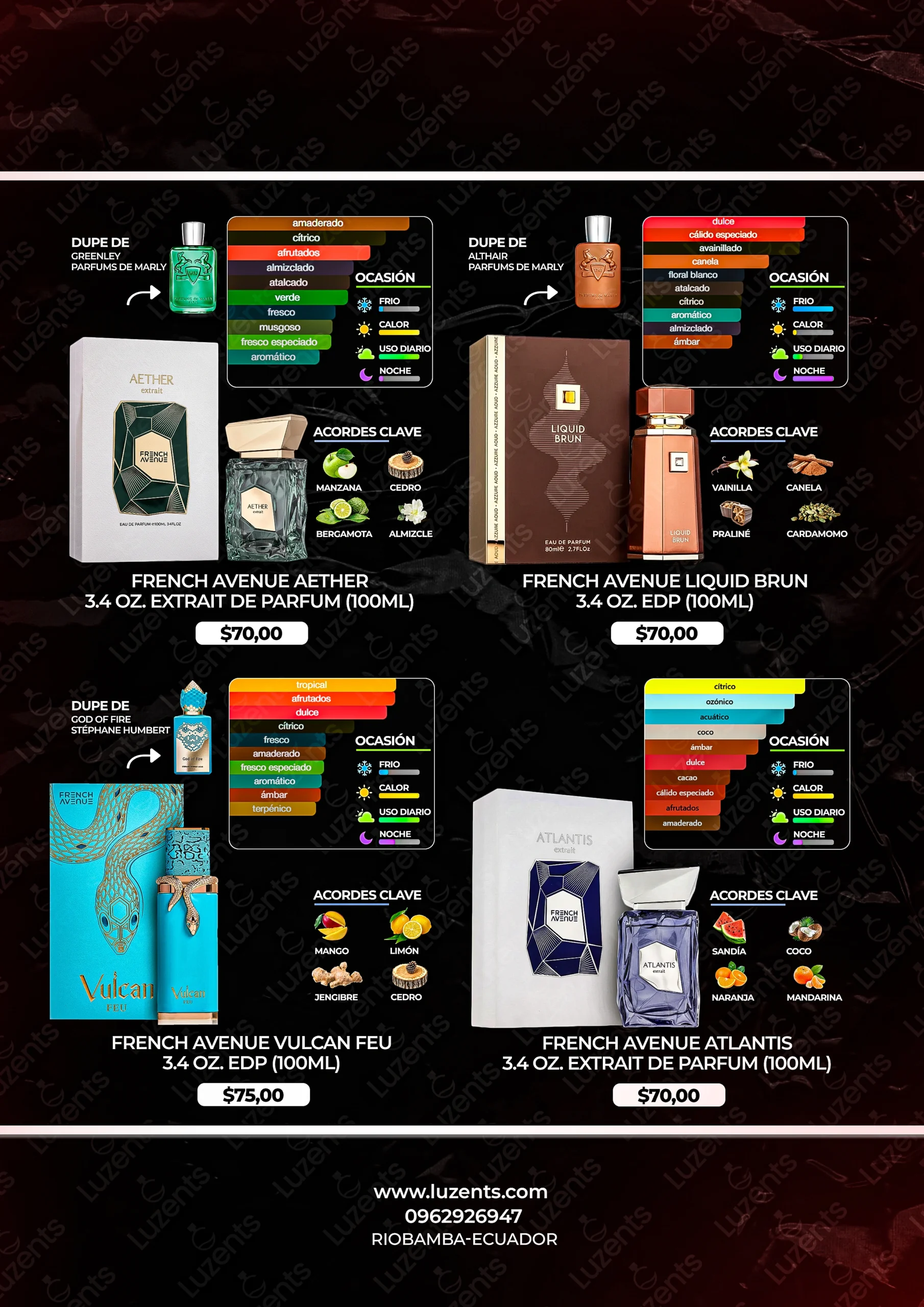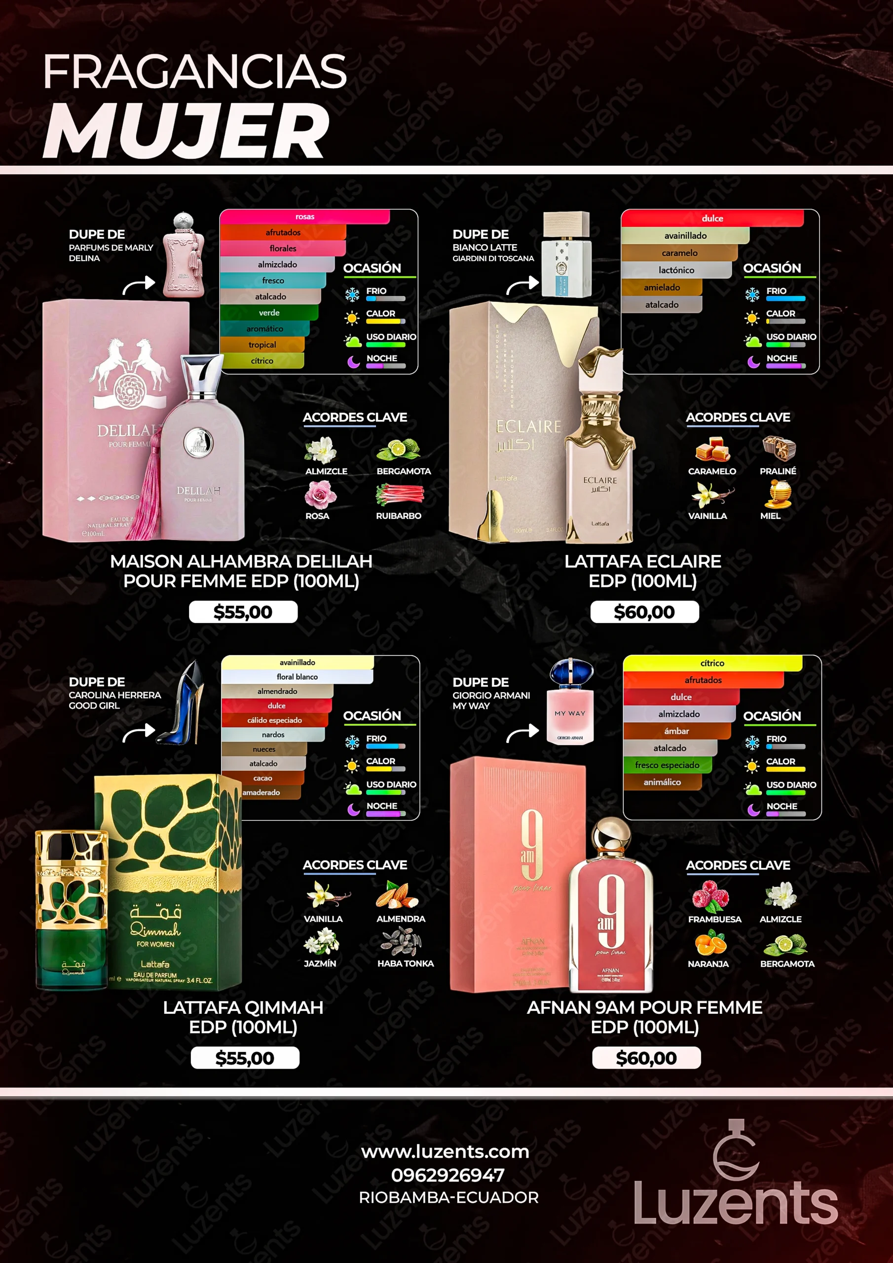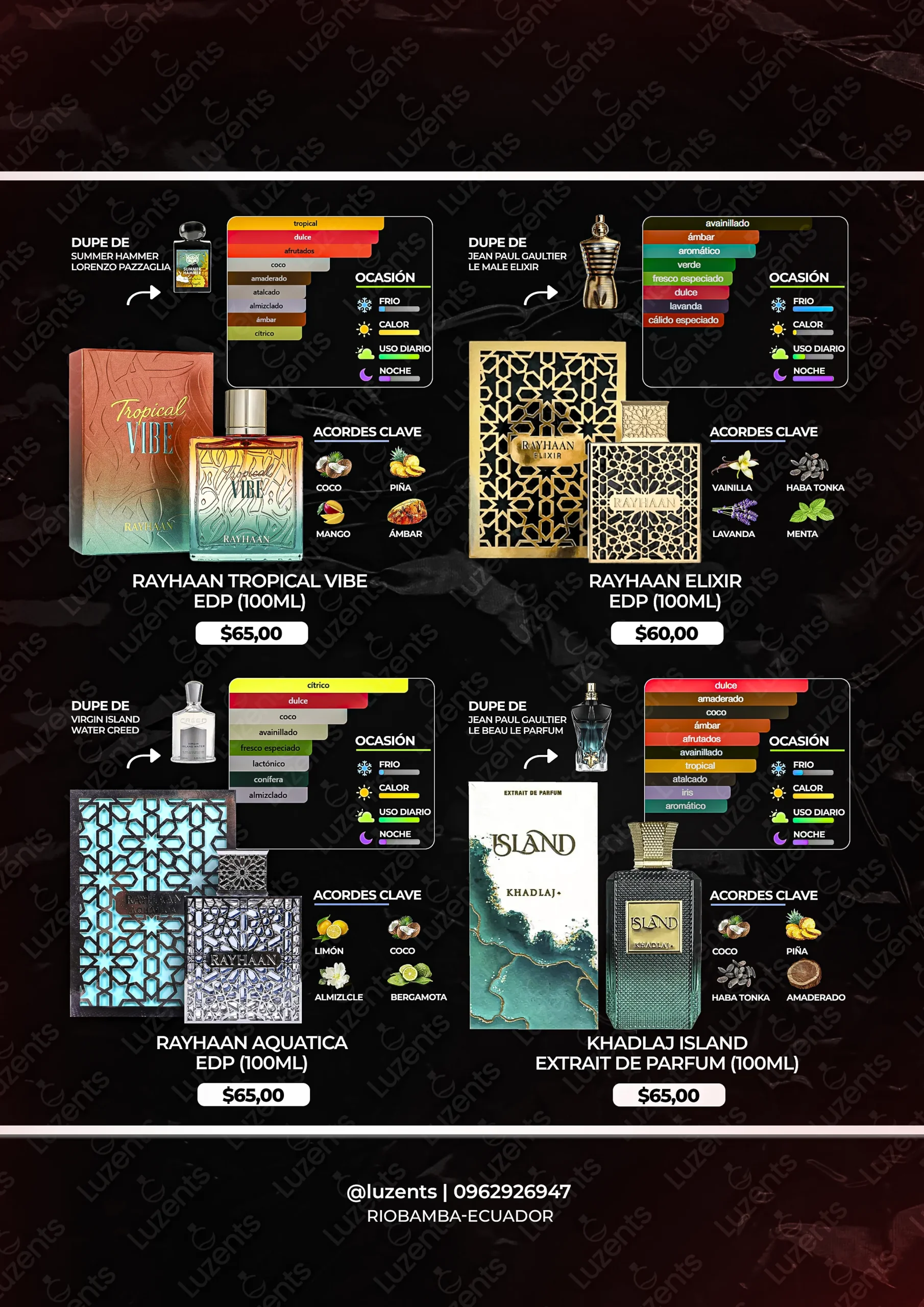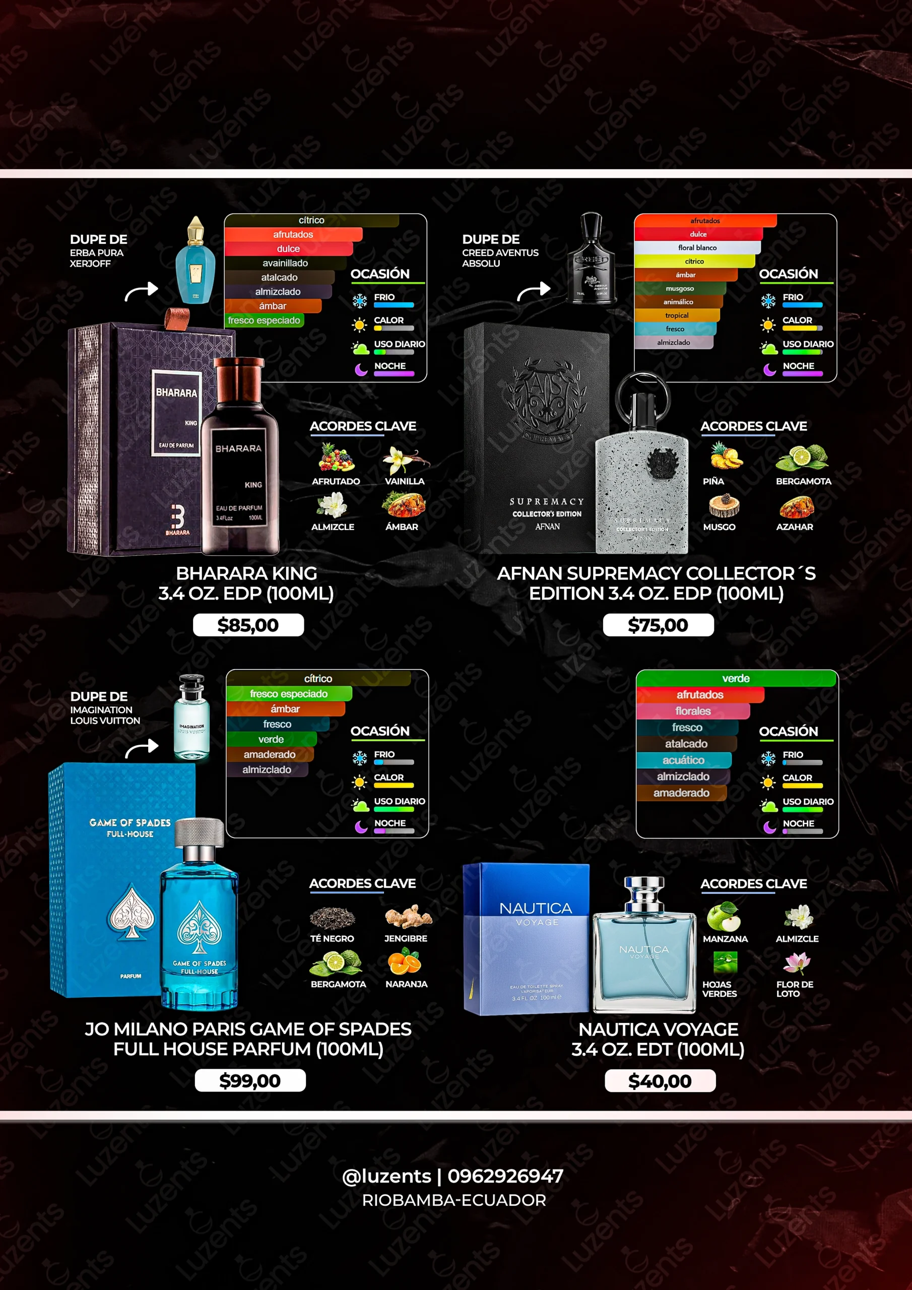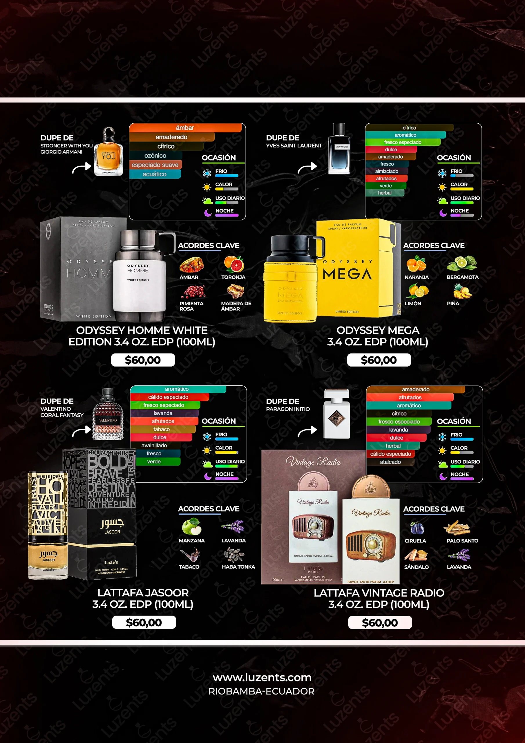 Bienvenido al catálogo exclusivo de Luzents, donde encontrarás la mejor selección de perfumes originales y decants en Ecuador. Nos especializamos en traer para ti las fragancias más deseadas de casas de diseñador y la mejor perfumería árabe, garantizando autenticidad en cada gota.